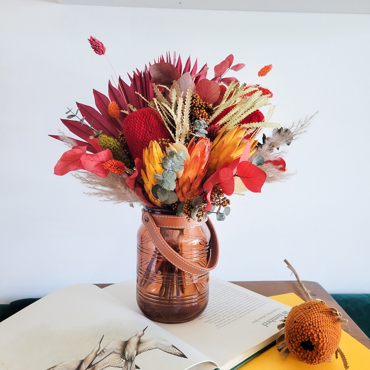 - Dried Boho Flower Bouquet with burnt orange and green colors: