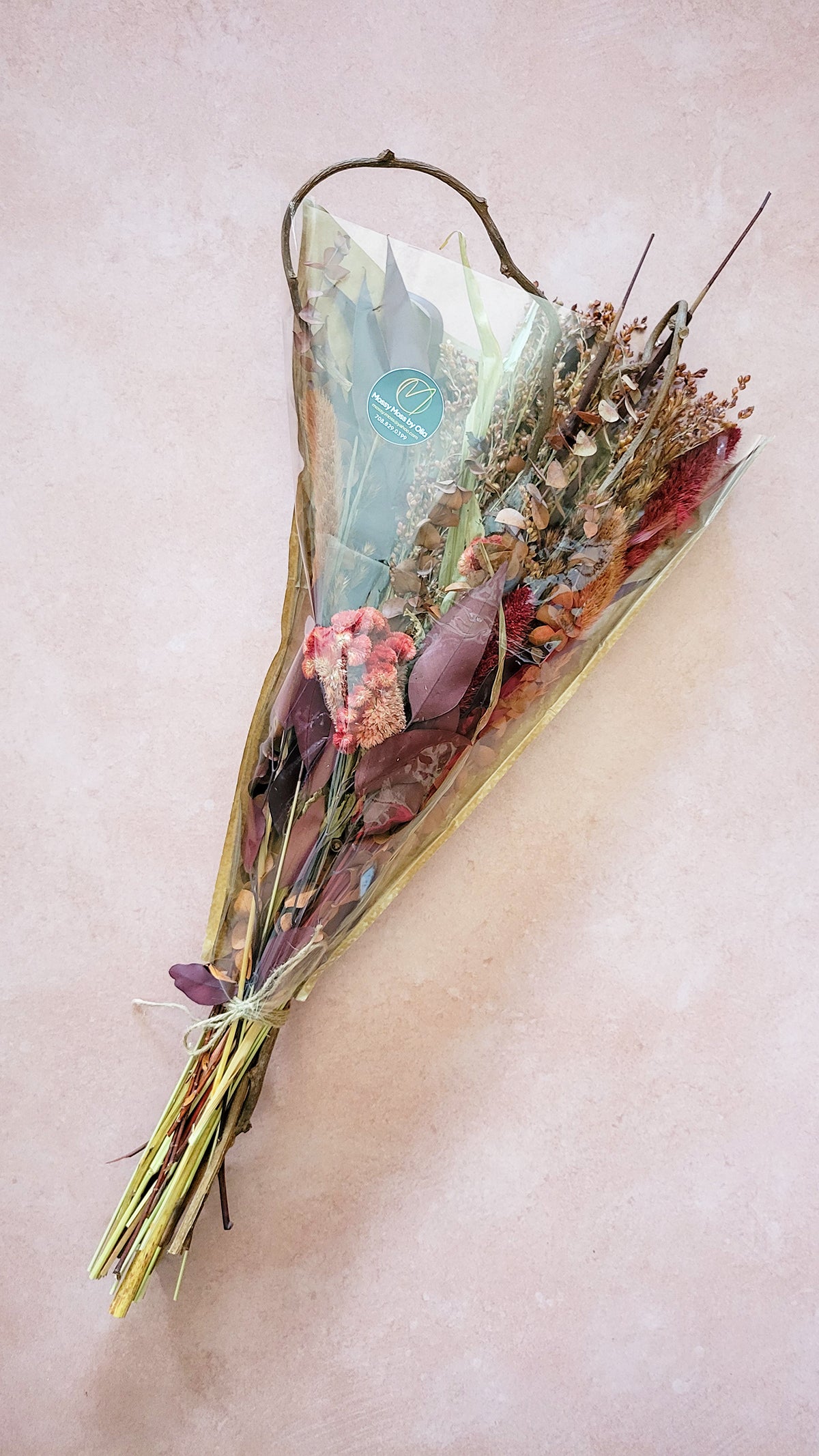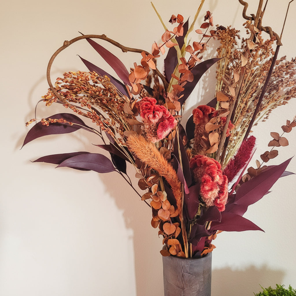This 24-inch fall bouquet features preserved burgundy eucalyptus, dried red merlot coxcomb, and ornamental grasses in rich autumn hues. It requires no watering and lasts for years, making it an ideal seasonal accent or gift. Customize colors to suit your style. Keep indoors away from direct sunlight for best longevity.