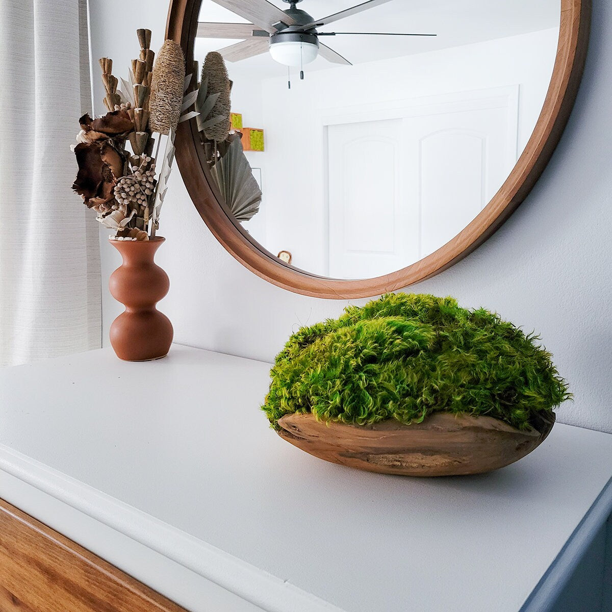 Introducing our Preserved Moss in Teak Wood Bowl, a harmonious blend of trendiness and tranquility. This preserved moss, with its vibrant green hues, brings a fresh touch to any space while instilling a sense of calm. Nestled within a hand-carved teak wood dough bowl, it transforms into a perfect centerpiece for your table. The combination of green moss and natural wood elements adds an inspiring touch to your home. Ideal for coffee tables, this piece embodies modern contemporary decoration, enhancing your interior with its chic appeal. Plus, the best part? No watering needed! However, to preserve its beauty, avoid direct sunlight, as it can fade the wood and moss. Please note that each natural wood bowl is unique, varying slightly in appearance and size. Elevate your decor with this trendy yet timeless addition.